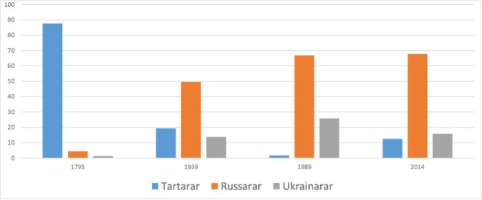Ein kan ikkje forstå Krym-spørsmålet utan kjennskap til historia(17). Russland annekterte Krym i 1783, etter mange krigar mot Det ottomanske imperiet og Krym-khanatet. Tolv år etter anneksjonen var nærmare 90 % av befolkninga framleis tartarsk. Tartarane hadde da dominert befolkninga i over 300 år. Eit dramatisk fall i andel tartarar i tida etterpå skriv seg frå immigrasjon knytt til den russiske koloniseringa, samt deportasjon av alle tartarane i 1944(18), altså etnisk reinsing(19). Det øvste Sovjet vedtok i 1989 at tartarane kunne vende tilbake til Krym, noe mange gjorde. Tala tyder ikkje på at Ukraina førte ein politikk som stimulerte til utflytting av russarar i perioden 1989–2014.